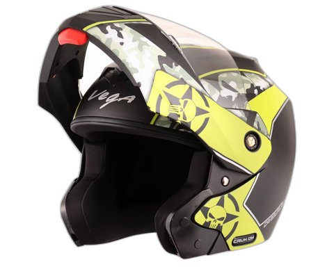 The H Vega Crux DX Camo Dull Black/Neon Yellow helmet is designed for riders who want to stand out with bold style while ensuring maximum safety. Featuring a distinctive camouflage pattern in dull black with vibrant neon yellow accents, this helmet blends modern aesthetics with performance. Made with a high-impact ABS shell, it provides excellent protection from impacts. The scratch-resistant, clear visor offers optimal visibility, while the lightweight and ergonomic design ensures comfort during long rides. ISI-certified, this helmet guarantees both safety and durability for riders who value style and protection.